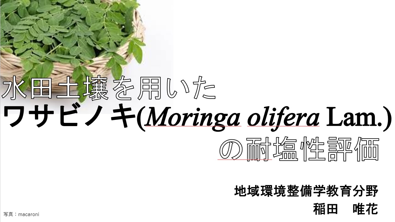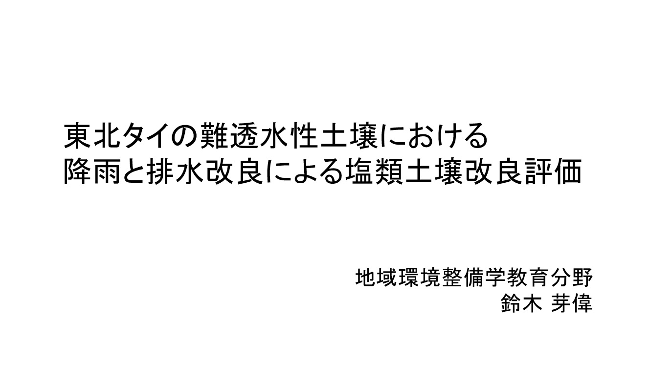 卒論発表会が終了しました 公開済み: 2020年2月19日更新: 2020年3月4日作成者: kumecsusカテゴリー: 今していること 研究室の鈴木さん、稲田さんの卒論発表が終わりました。 ふたりとも、このタイプロジェクトの関連の研究をしっかりやってくれて、 素晴らしい発表をしてくれたと思います。 とりあえずタイトルだけupします。 お疲れ様でした。 関連記事 耐塩性作物栽培実験について コンケン大学の作物栽培実験場に行ってきました。 博士課程のJos君が頑張って作業をしてくれています。 塩類土壌にVermicompostとココナッツ廃棄物を混ぜたものが一番生育に効くとの結果が出てきています。 室内実験は […] 公開済み: 2019年8月30日更新: 2019年12月6日作成者: kumecsusカテゴリー: 今していること 塩害や天候等のリスクへの農家の対応に関する現地調査 東農大の松田さんが標記の調査をコンケンで実施してくれています。 コンケン大の学生さんと、あらかじめ作成しておいた質問票を タブレットやスマホを用いて入力し自動集計するシステムを使っています。 対象地区の約120世帯を対象 […] 公開済み: 2020年1月9日更新: 2020年3月3日作成者: kumecsusカテゴリー: 今していること 17 CSUSの工事 コンケン大学のDr. Chuleemasより、 カスケード型塩類利用システム The Cascading Salts Using System:the CSUS の工事が順調に進んでいるとの連絡がありました。この記事では […] 公開済み: 2019年4月17日更新: 2019年4月17日作成者: kumecsusカテゴリー: 今していること